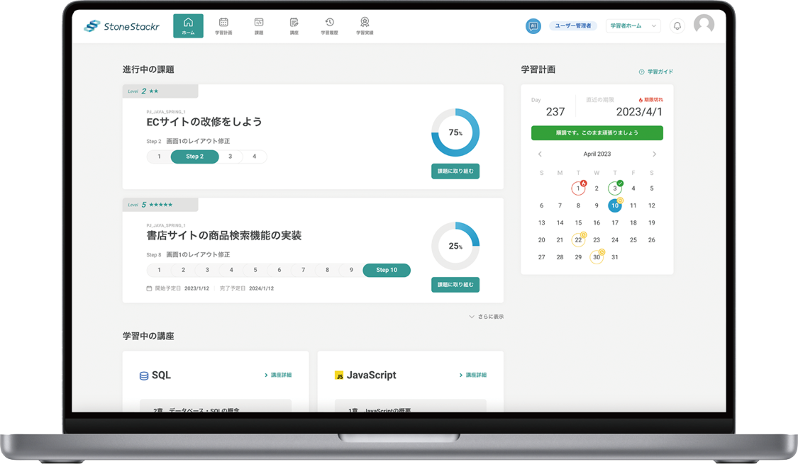 StoneStackrは、管理者が学習者のスキルを把握しやすいのも大きな特徴です。現在学習者が取り組んでいる課題はもちろん、学習計画や進捗状況、理解度も確認できます。