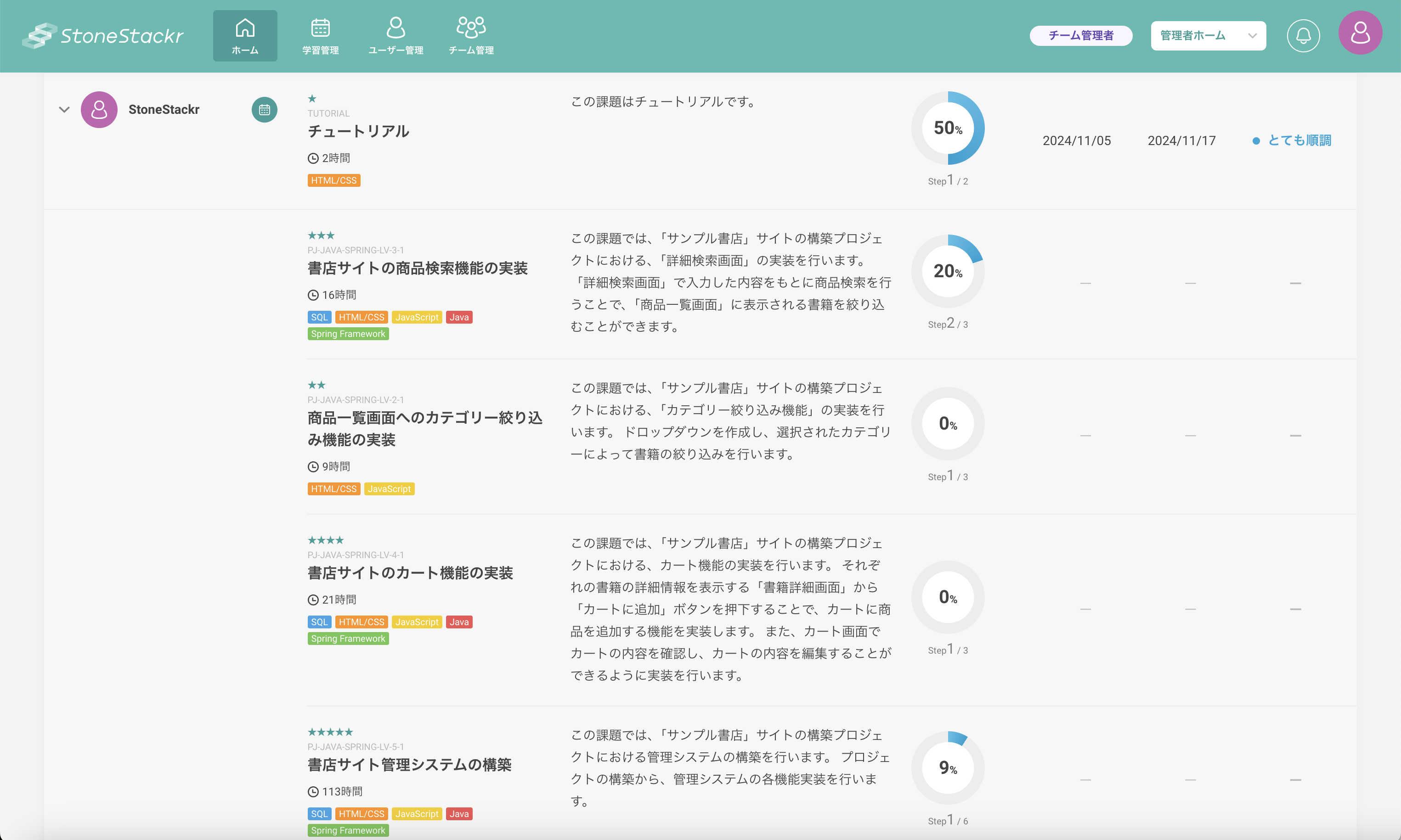 StoneStackrは、管理者が学習者のスキルを把握しやすいのも大きな特徴です。現在学習者が取り組んでいる課題はもちろん、学習計画や進捗状況、理解度も確認できます。